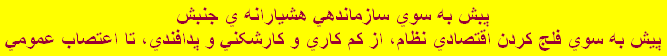 در "کار سازمانی"، راهنمای ما "انجمن های مخفی و کوچـــــــــــــــــک و پراکنده و غیرقابل کنترل" انقلاب مشروطه هستند، متشکل از "بابکیان" بسیار قابل اعتماد. به گفته استاد سخن و خرد و داد، فردوسی: "هشیوار یاران گزین در نبرد". "انجمن های بابکی" که بجاست کار سازمانی "غیر زنجیره ای" را (با درس گیری از اشتباه های دهه ی چهل و پنجاه خورشیدی) با کار "توده ای"، بسیار حساب شده درهم آمیزند، در کوران نبرد و در آستانه ی پیروزی، "هشیارانه و گام به گام" به هم خواهند پیوست، و ایرانی آزاد و آباد و پرداد و توانمند را بنيان خواهند نهاد. پيش به سوي ايجاد “انجمن هاي بابکي” در همه ي يکان هاي اقتصادي و آموزشي، و تدارک اعتصاب عمومي! هشيار باشيم، نبايد گذاشت رويدادهايي چون ليبي و بحرين در ايران بازخواني شوند. تنش آفرينان در حال بازآفريدن رخدادهاي آغاز انقلاب در ايران و منطقه هستند. بايد هر چه زودتر “به اين شب سياه” پايان داد. در این راستا می توان از شیوه های سازمانی و مبارزاتی "تدافعی" در دیگر جنبش های رهایی بخش نیز، همانا به میدان آوردن "پدافندان" (در کنار "انجمن های بابکی") بهره گرفت: هم برای شناسایی و افشاگری و خنثی سازی "عوامل" ناآشکار و آشکار این "تنش آفرینان و دزدان" در کارخانه ها و آموزشگاه ها و اداره ها و محله ها و بازارها، و هم به منظور نشانه گرفتن برجسته ترین مراکز کلیدی، چون کانون های بازرگانی و مالی و تامین انرژی و حمل و نقل. همانگونه که "عمامه به سرهای ولایی" از ترسشان در خیابان ها آشکار نمی شوند، می توان این "عوامل" را در یکان های اقتصادی و آموزشی وادار به عقب نشینی کرد و خنثی نمود. این رویکردها در راستای تدارک "اعتصاب عمومی"، و از کار انداختن همزمان مهم ترین یکان های اقتصادی و کانون های آموزشی-اداری جریان خواهد داشت